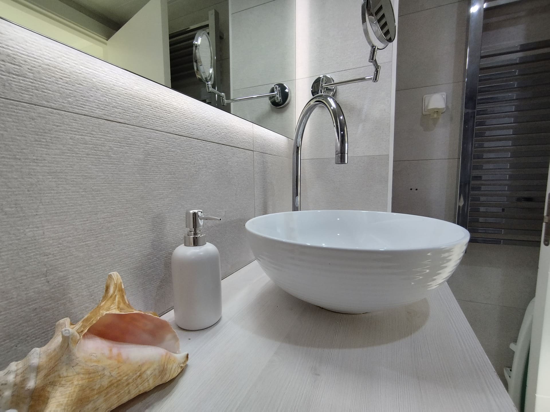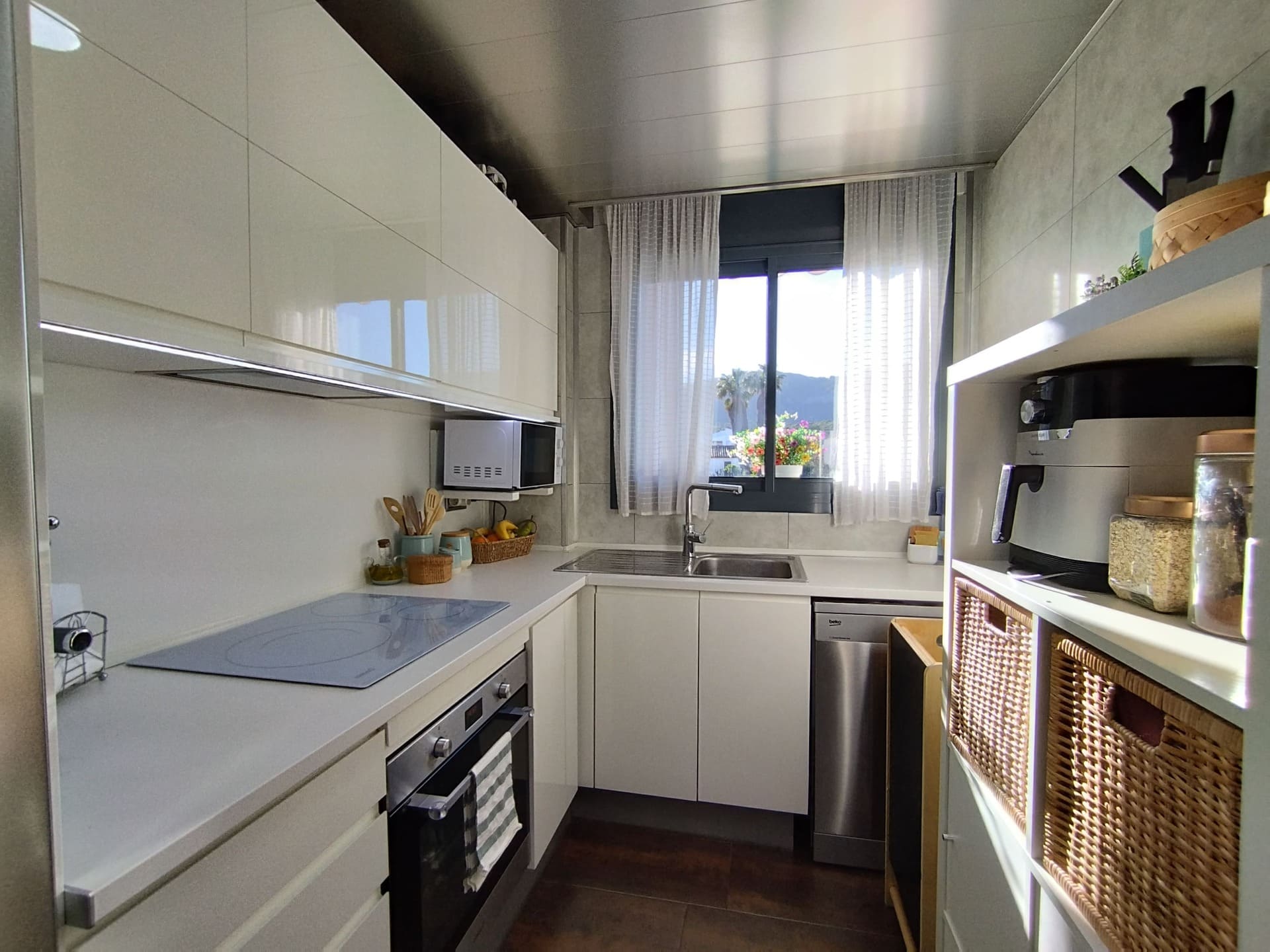 En la planta principal encontramos una cocina equipada con placa vitrocerámica, horno, armarios de calidad y iluminación LED indirecta, todo cuidadosamente conservado. El salón-comedor tiene salida a una terraza privada, perfecta para disfrutar de las vistas al parque y los atardeceres en la montaña. Además, dispone de un baño completo con plato de ducha, lavamanos sobre encimera y radiador toallero, junto a dos habitaciones, una doble con acceso a la terraza y otra individual.